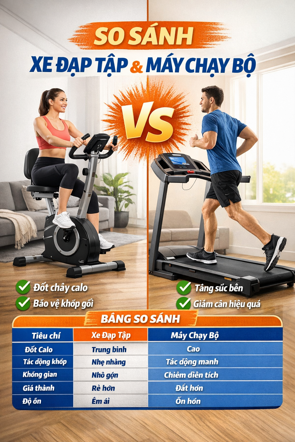 | Tiêu chí | Xe đạp tập | Máy chạy bộ |